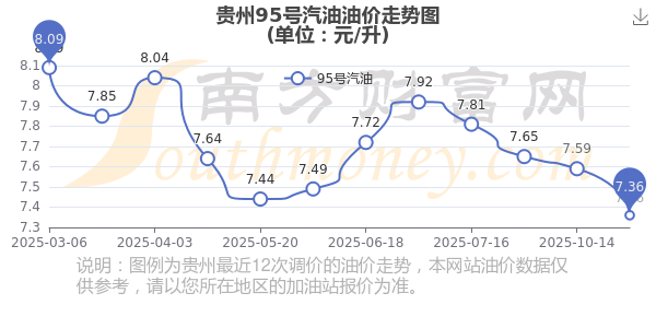 11月10日,貴州95號(hào)汽油的價(jià)格是7.36元每升,本次的調(diào)整時(shí)間為10月28日,對比上次的調(diào)整下跌了0.23元,下跌3.03%,下次調(diào)整時(shí)間為11月10日24時(shí),還有0.6天。