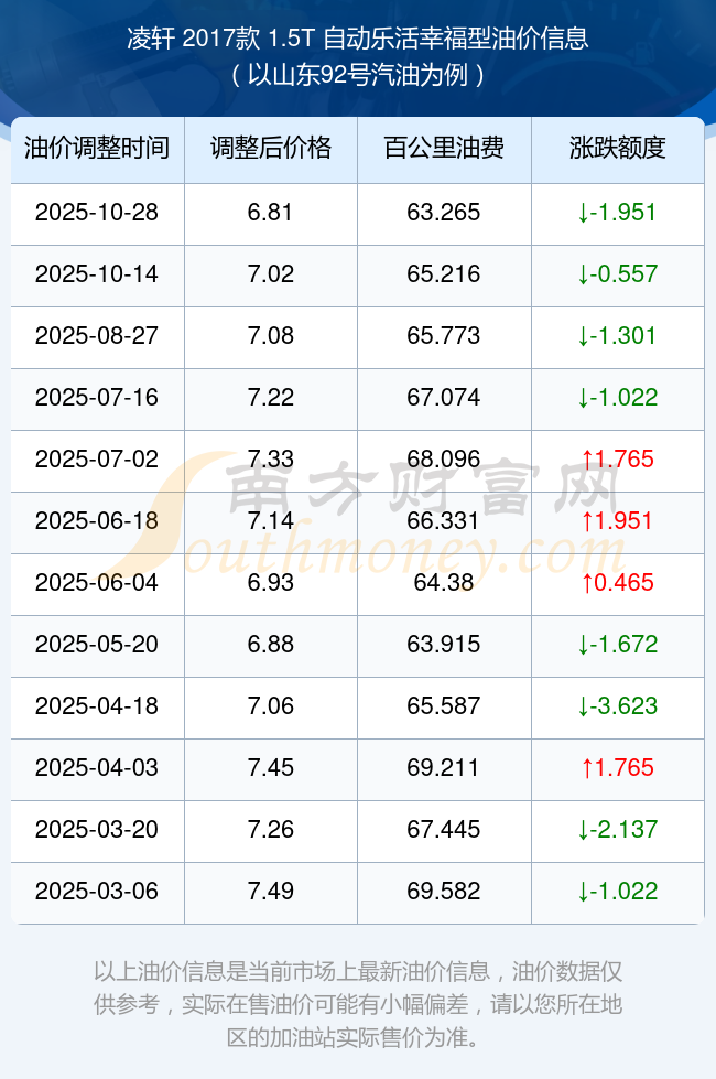 按照10月28日92號汽油最新調(diào)整價格6.81元/升來計算(以山東為例),該車型百公里平均油費為63.265元,按照上一輪10月14日調(diào)整價格7.02元/升來計算,百公里平均油費為65.216元,對比上一輪少花1.951元,下一輪油價調(diào)整時間為11月10日24時。