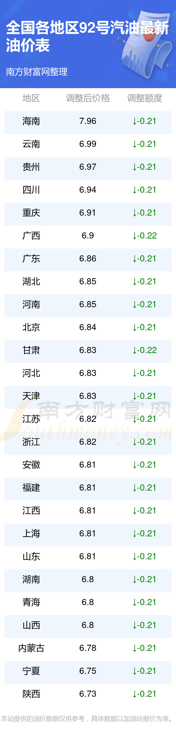 全國92號汽油最新平均價格為:7元每升,其中,最低為陜西,價格為6.73元/升,最高為海南,價格為7.96元/升。