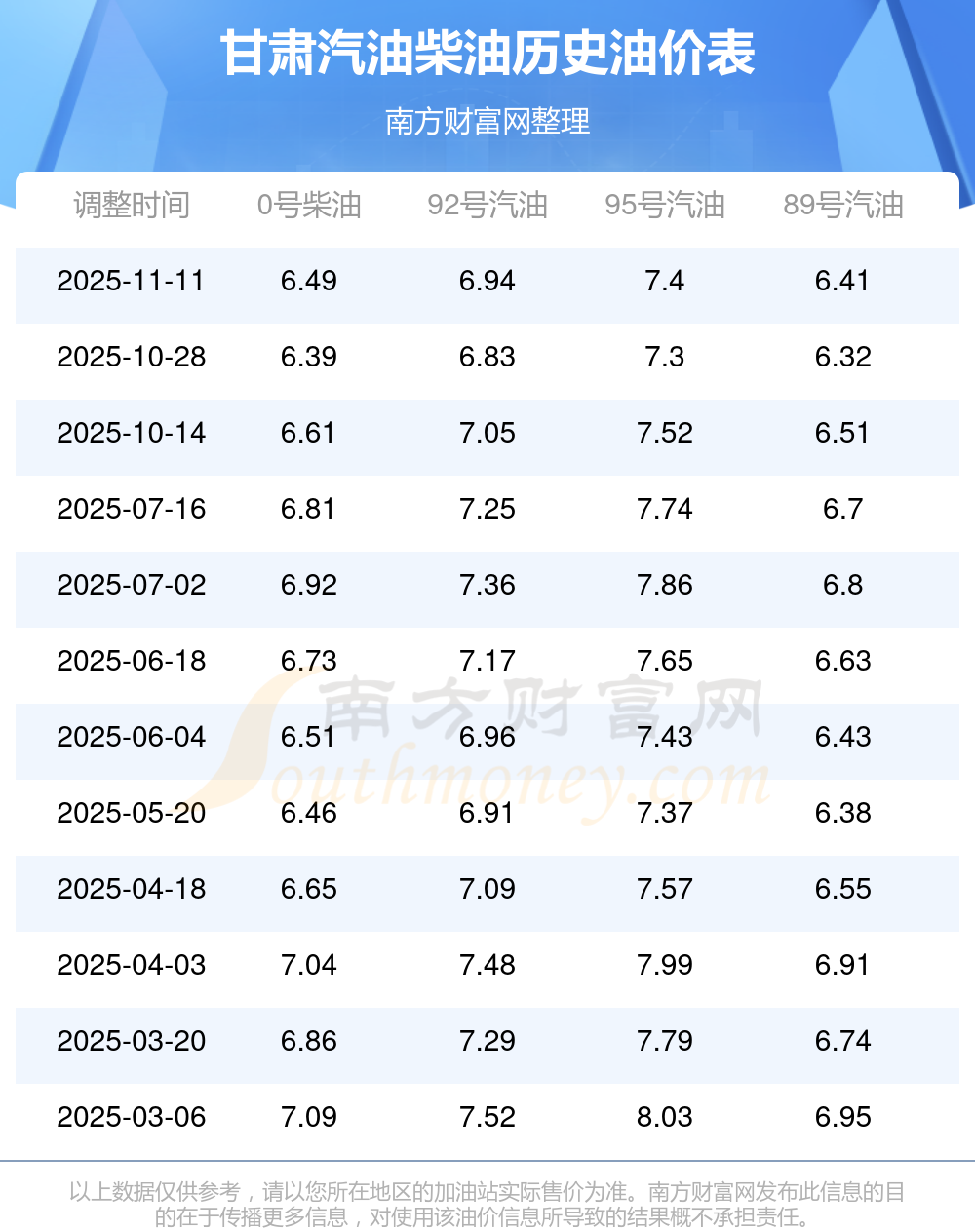 2025年甘肅汽油價格一覽表