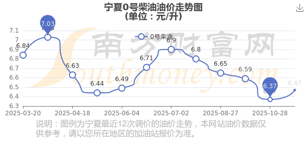 11月11日,寧夏0號(hào)柴油的價(jià)格是6.47元每升,本次的調(diào)整時(shí)間為11月11日,對(duì)比上次的調(diào)整增了0.1元,增1.57%,11月24日24時(shí)為下一輪油價(jià)調(diào)整時(shí)間,還有13.77天。