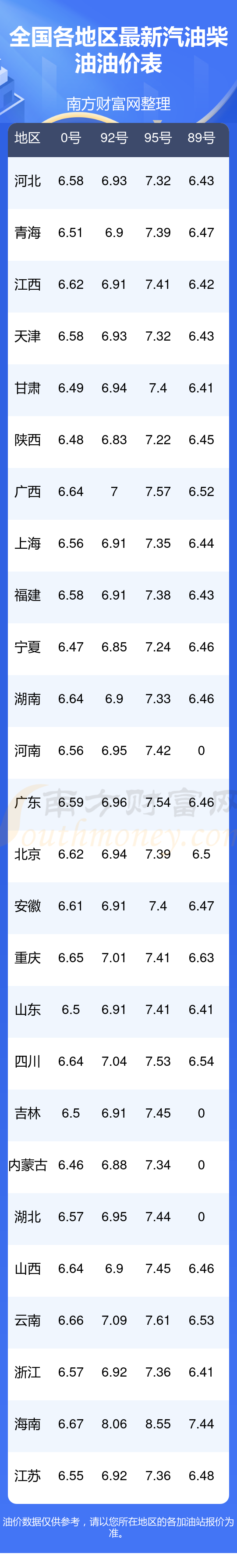 全國(guó)89號(hào)汽油平均價(jià)格為:7元每升,其中,最低為浙江,價(jià)格6.41元/升,最高為海南,價(jià)格7.44元/升。