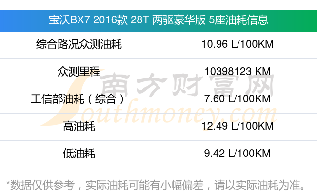 根據(jù)車主實(shí)測(cè)數(shù)據(jù),該車型低油耗為9.42升每百公里,高油耗為12.49升每百公里,綜合路況眾測(cè)油耗為10.96升每百公里,工信部綜合油耗為7.60升每百公里。