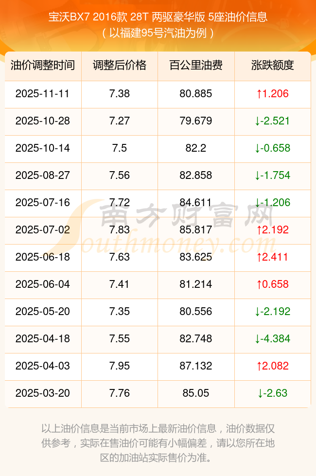 按11月11日95號(hào)汽油最新調(diào)整價(jià)格7.38元每升來(lái)計(jì)算(以福建為例),該車型百公里平均油費(fèi)為80.885元,按上一輪10月28日調(diào)整價(jià)格7.27元每升來(lái)計(jì)算,百公里平均油費(fèi)為79.679元,對(duì)比上一輪多花1.206元,下一輪油價(jià)調(diào)整時(shí)間為11月24日24時(shí)。