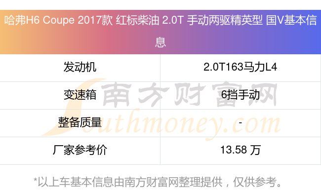 哈弗H6 Coupe 2017款 紅標(biāo)柴油 2.0T 手動兩驅(qū)精英型 國V動力方面,搭載的是一臺2.0T163馬力L4渦輪增壓發(fā)動機,匹配6擋手動擋變速箱,燃料形式為柴油,廠家參考價13.58萬元。