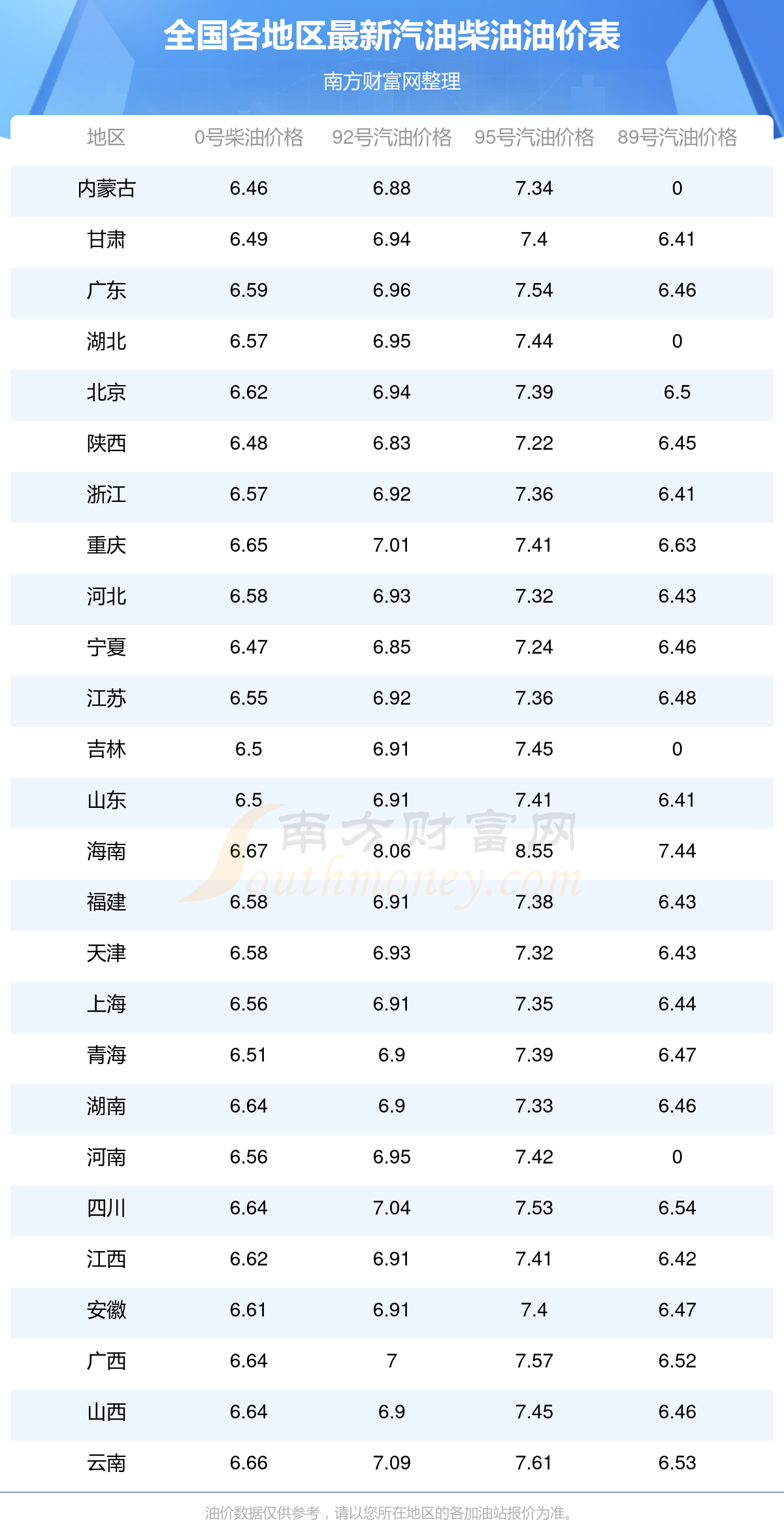 油價數(shù)據(jù)僅供參考,請以您所在地區(qū)的加油站報價為準(zhǔn)。南方財富網(wǎng)發(fā)布此信息的目的在于傳播更多信息,對使用該油價信息所導(dǎo)致的結(jié)果概不承擔(dān)任何責(zé)任。