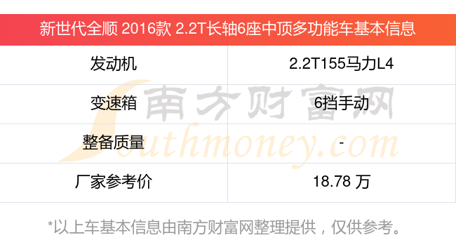 新世代全順 2016款 2.2T長(zhǎng)軸6座中頂多功能車動(dòng)力上搭載的是一臺(tái)2.2T155馬力L4渦輪增壓發(fā)動(dòng)機(jī),匹配6擋手動(dòng)擋變速箱,燃料形式為柴油,廠家參考價(jià)18.78萬元。