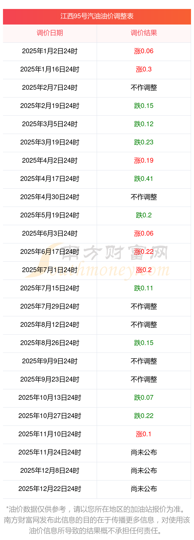 11月11日,江西95號汽油的價格是7.41元每升,本次的調(diào)整時間為11月11日,對比上次的調(diào)整漲了0.1元,漲1.368%,下次調(diào)整時間為11月24日24時,還有13.72天。