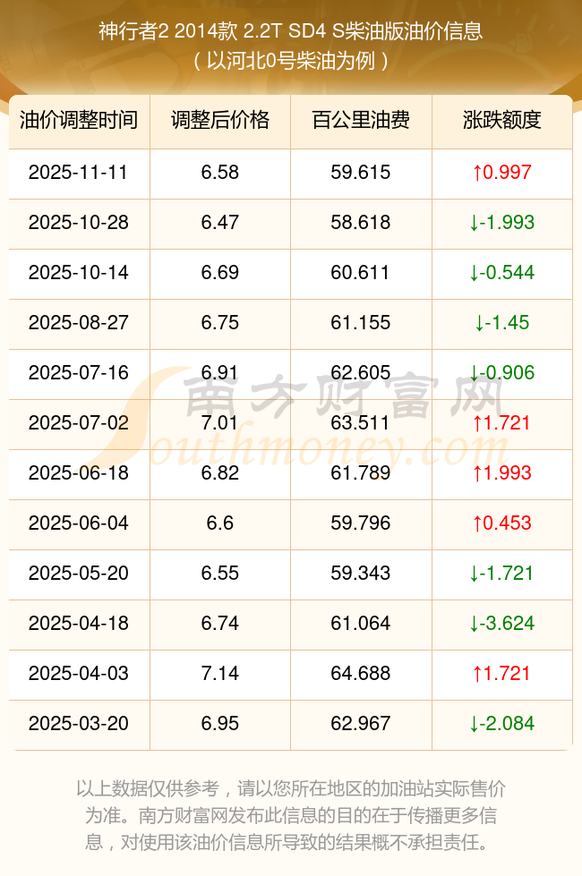 按11月11日0號(hào)柴油最新調(diào)整價(jià)格6.58元每升來(lái)計(jì)算(以河北為例),該車(chē)型百公里平均油費(fèi)為59.615元,按上一輪10月28日調(diào)整價(jià)格6.47元每升來(lái)計(jì)算,百公里平均油費(fèi)為58.618元,對(duì)比上一輪多花0.997元,下一輪油價(jià)調(diào)整時(shí)間為11月24日24時(shí)。