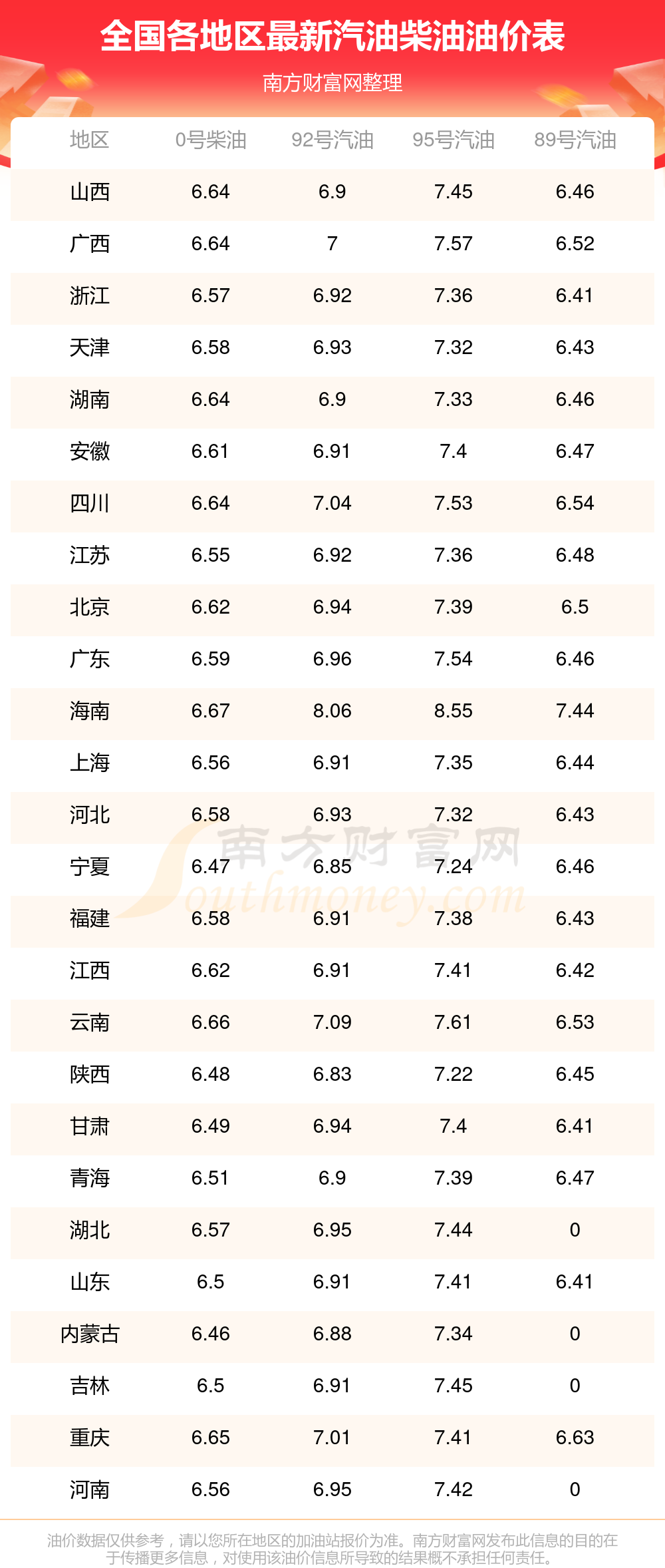 油價數(shù)據(jù)僅供參考,請以您所在地區(qū)的加油站報價為準。南方財富網(wǎng)發(fā)布此信息的目的在于傳播更多信息,對使用該油價信息所導致的結(jié)果概不承擔任何責任。
