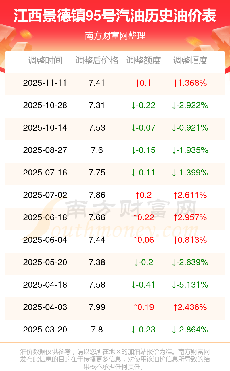 2025年95號(hào)汽油價(jià)格調(diào)整一覽表