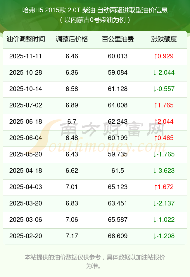 依照11月11日0號(hào)柴油最新調(diào)整價(jià)格6.46元/升來(lái)計(jì)算(以內(nèi)蒙古為例),該車(chē)型百公里的平均油費(fèi)是60.013元,依照上一輪10月28日調(diào)整價(jià)格6.36元/升來(lái)計(jì)算,百公里的平均油費(fèi)是59.084元,對(duì)比上一輪多花0.929元,下一輪的油價(jià)調(diào)整時(shí)間11月24日24時(shí)。