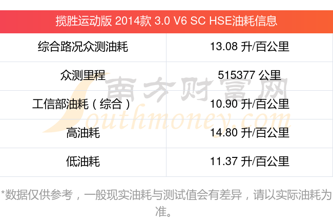 根據(jù)多位車主實測得出數(shù)據(jù),該車型低油耗為11.37L/100km,高油耗為14.80L/100km,綜合路況眾測油耗為13.08L/100km,工信部綜合油耗為10.90L/100km。