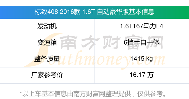 標(biāo)致408 2016款 1.6T 自動(dòng)豪華版動(dòng)力上配備的是一臺(tái)1.6T167馬力L4渦輪增壓發(fā)動(dòng)機(jī),匹配的是6擋手自一體自動(dòng)檔變速箱,燃料形式為汽油,常規(guī)整備質(zhì)量1415kg,廠家參考價(jià)16.17萬元。