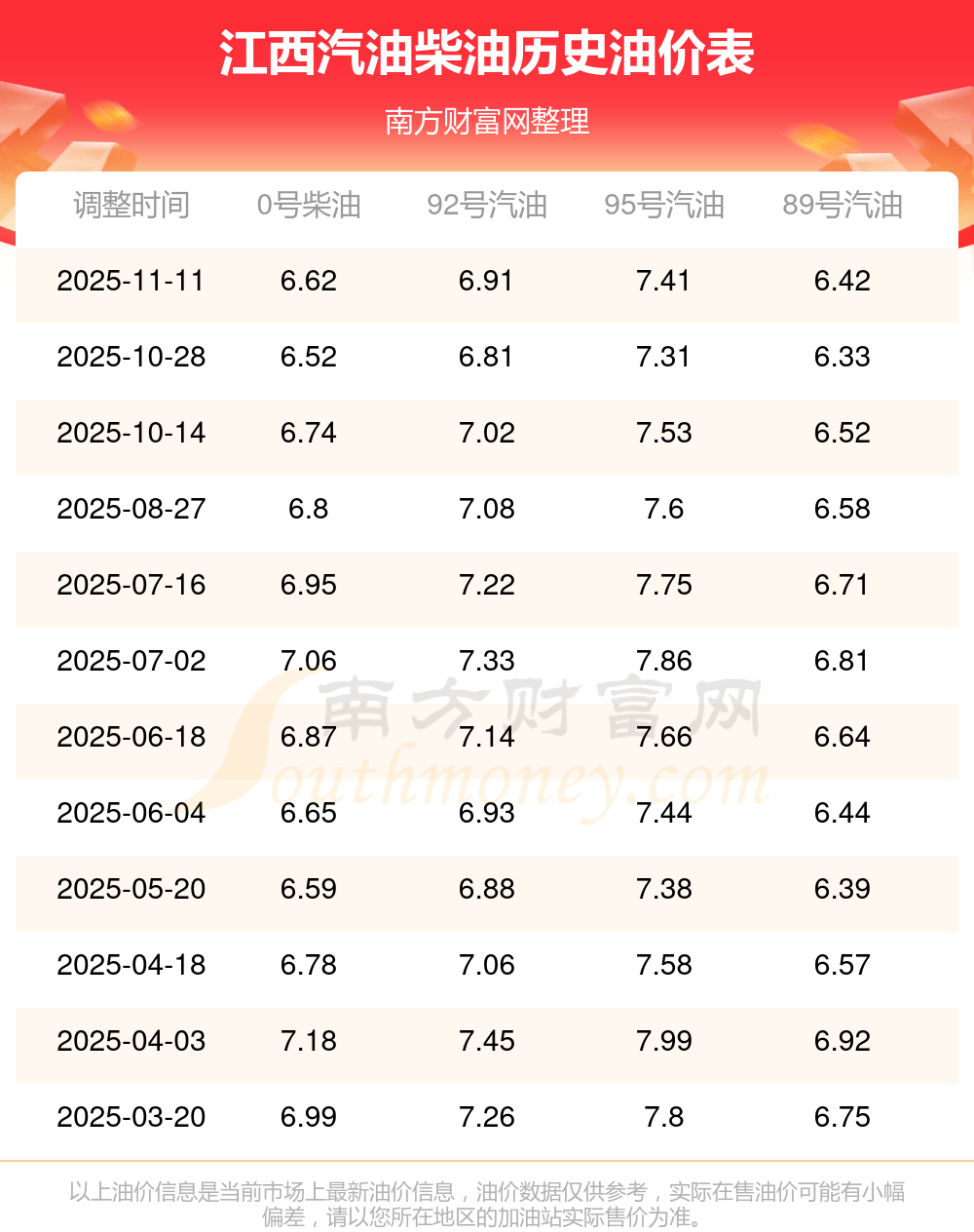 11月11日,江西0號(hào)柴油的價(jià)格是6.62元每升,本次的調(diào)整時(shí)間為11月11日,對(duì)比上次的調(diào)整上漲了0.1元,上漲1.534%,11月24日24時(shí)為下一輪油價(jià)調(diào)整時(shí)間,還有13.62天。