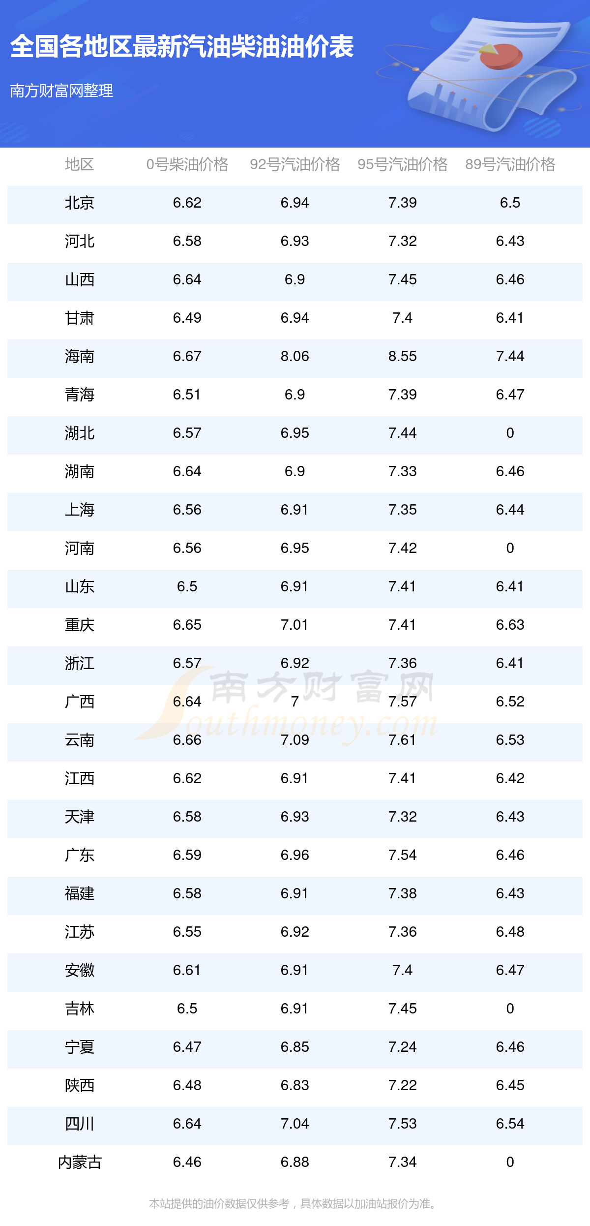 油價(jià)數(shù)據(jù)僅供參考,請(qǐng)以您所在地區(qū)的加油站報(bào)價(jià)為準(zhǔn)。南方財(cái)富網(wǎng)發(fā)布此信息的目的在于傳播更多信息,對(duì)使用該油價(jià)信息所導(dǎo)致的結(jié)果概不承擔(dān)任何責(zé)任。