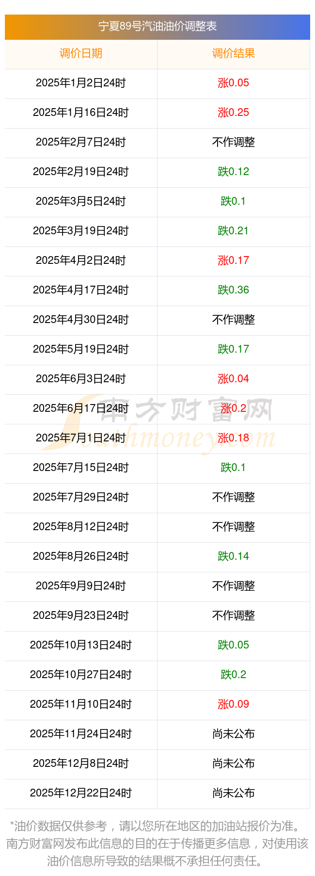 11月11日全國(guó)89號(hào)汽油的價(jià)格為11月11日油價(jià)調(diào)整后的價(jià)格,其中,平均價(jià)格為7元每升,最低為浙江,價(jià)格6.41元/升,最高為海南,價(jià)格7.44元/升。下一輪油價(jià)調(diào)整時(shí)間11月24日24時(shí),距離現(xiàn)在還有13.62天。