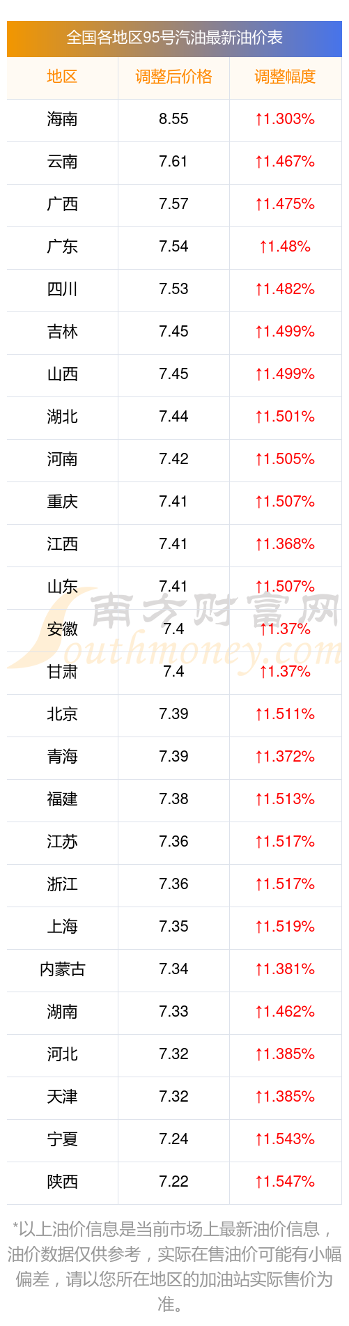 全國95號汽油平均價格為:7元每升,其中,最低為陜西,價格7.22元/升,最高為海南,價格8.55元/升。