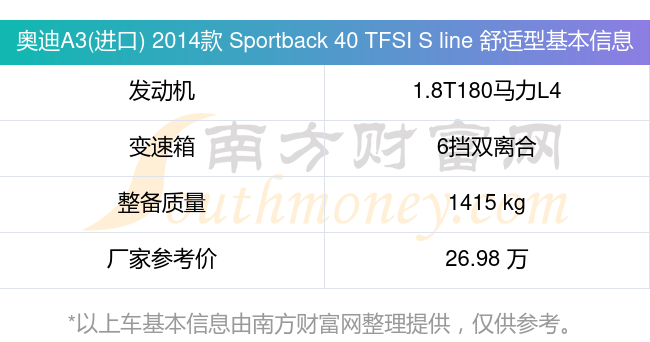 奧迪A3(進口) 2014款 Sportback 40 TFSI S line 舒適型動力方面,搭載的是一臺1.8T180馬力L4渦輪增壓發(fā)動機,匹配6擋雙離合自動檔變速箱,燃料形式為汽油,常規(guī)整備質(zhì)量1415kg,廠家參考價26.98萬元。