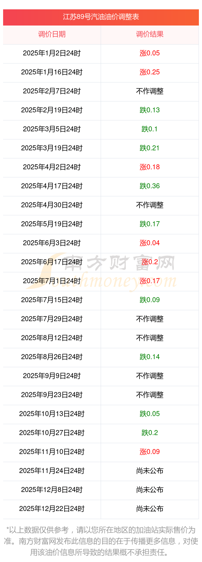 江蘇89號汽油油價調(diào)整表