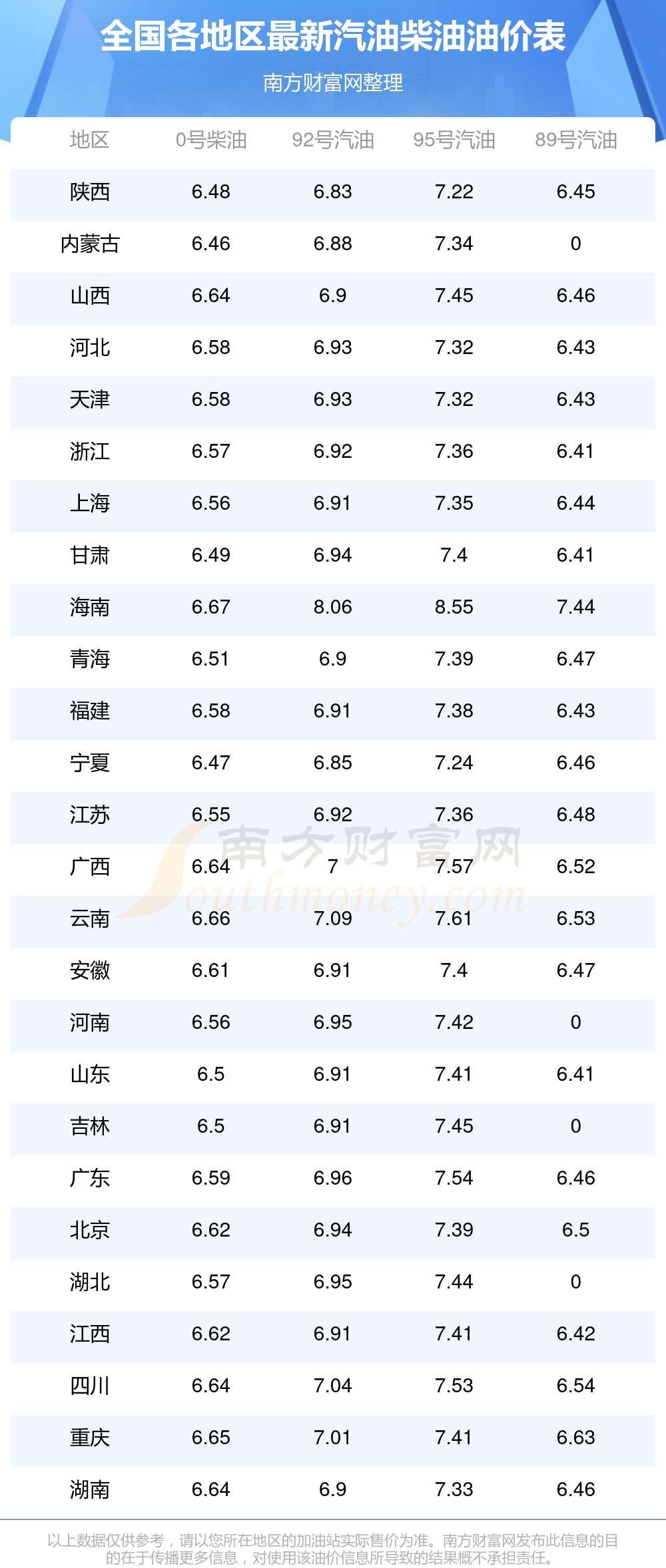 全國89號汽油最新平均價格為:7元每升,其中,最低為浙江,價格為6.41元/升,最高為海南,價格為7.44元/升。