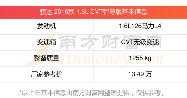 騏達 2016款 1.6L CVT智尊版動力上配備的是一臺1.6L126馬力L4自然吸氣發(fā)動機,匹配的是CVT無級變速自動檔變速箱,燃料形式為汽油,常規(guī)整備質(zhì)量1255kg,廠家參考價13.49萬元。