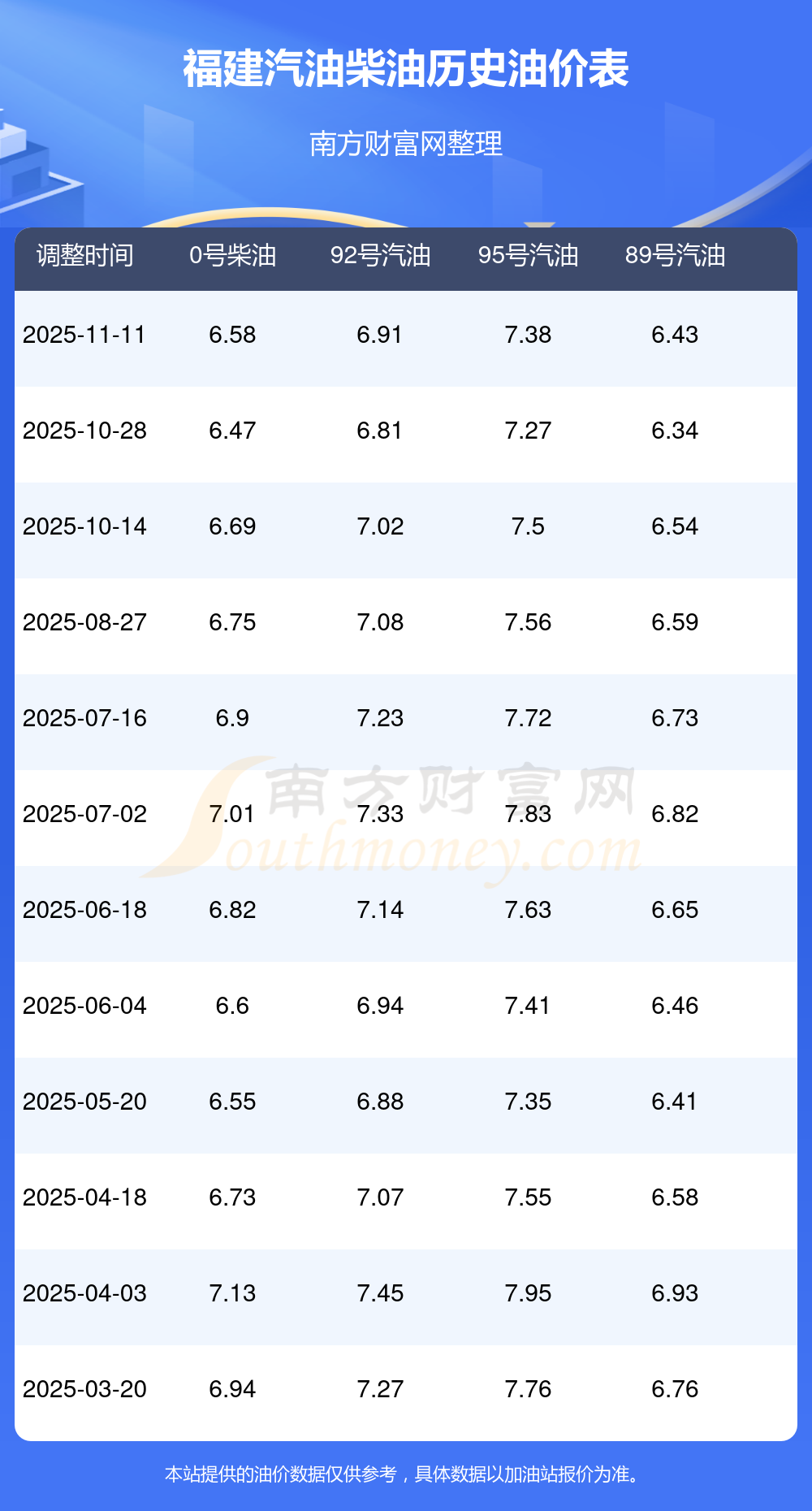 11月11日,福建95號(hào)汽油的價(jià)格是7.38元每升,本次的調(diào)整時(shí)間為11月11日,對(duì)比上次的調(diào)整漲了0.11元,漲1.513%,下次調(diào)整時(shí)間為11月24日24時(shí),還有13.58天。