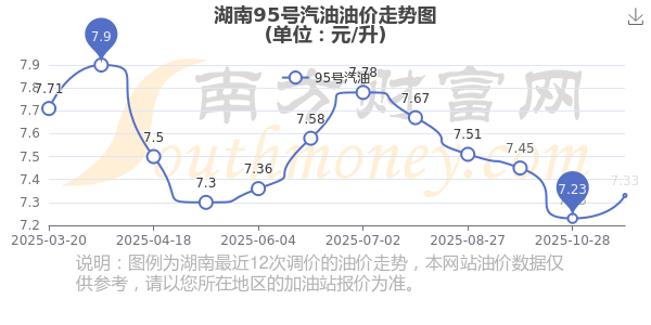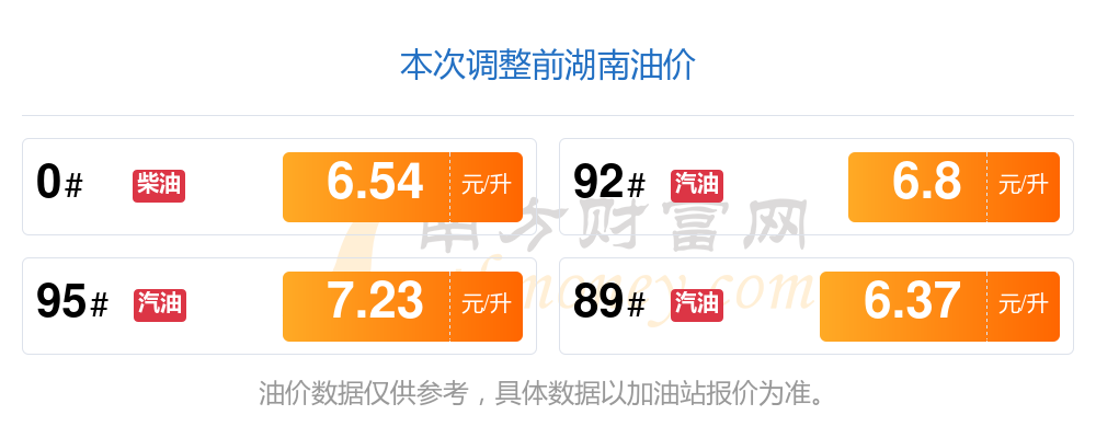 湖南汽油、柴油11月11日每升最新價(jià)格為:92號(hào)汽油為6.9元;95號(hào)汽油為7.33元;89號(hào)汽油為6.46元,上升了0.09;0號(hào)柴油為6.64元,調(diào)整時(shí)間為11月11日。
