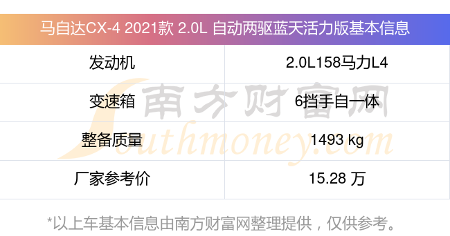 在動(dòng)力上,馬自達(dá)CX-4 2021款 2.0L 自動(dòng)兩驅(qū)藍(lán)天活力版配備的是一臺(tái)2.0L158馬力L4自然吸氣發(fā)動(dòng)機(jī),匹配的是6擋手自一體自動(dòng)檔變速箱,燃料形式為汽油,常規(guī)整備質(zhì)量1493kg,廠家參考價(jià)15.28萬(wàn)元。