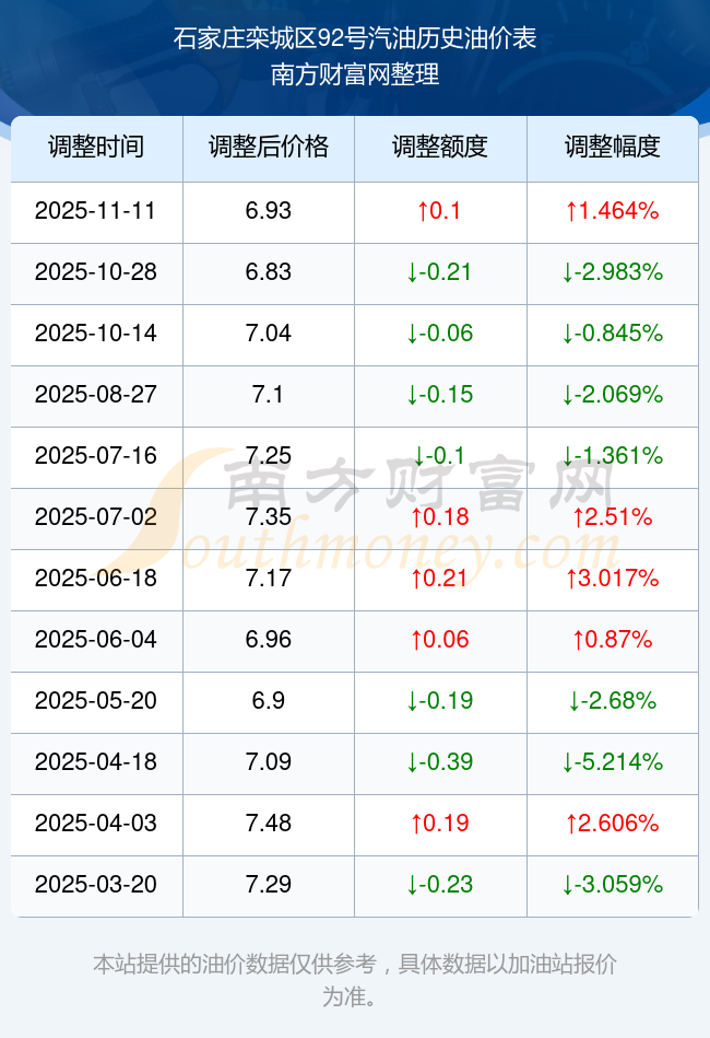 11月11日石家莊欒城區(qū)92號(hào)汽油歷史油價(jià)調(diào)整一覽表