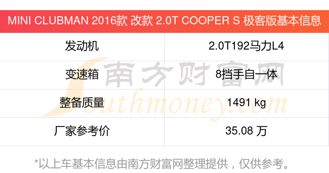 MINI CLUBMAN 2016款 改款 2.0T COOPER S 極客版動力上搭載的是一臺2.0T192馬力L4渦輪增壓發(fā)動機(jī),匹配8擋手自一體自動檔變速箱,燃料形式為汽油,常規(guī)整備質(zhì)量1491kg,廠家參考價(jià)35.08萬元。