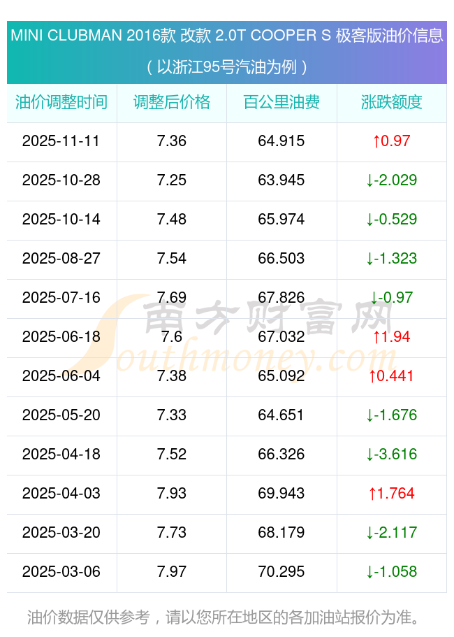 按照11月11日95號汽油最新調(diào)整價(jià)格7.36元/升來計(jì)算(以浙江為例),該車型百公里平均油費(fèi)為64.915元,按照上一輪10月28日調(diào)整價(jià)格7.25元/升來計(jì)算,百公里平均油費(fèi)為63.945元,對比上一輪多花0.97元,下一輪油價(jià)調(diào)整時(shí)間為11月24日24時(shí)。