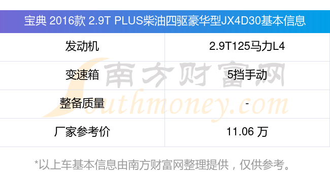寶典 2016款 2.9T PLUS柴油四驅(qū)豪華型JX4D30動力上搭載的是一臺2.9T125馬力L4渦輪增壓發(fā)動機(jī),匹配5擋手動擋變速箱,燃料形式為柴油,廠家參考價11.06萬元。