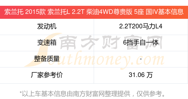 在動力方面,索蘭托 2015款 索蘭托L 2.2T 柴油4WD尊貴版 5座 國IV搭載的是一臺2.2T200馬力L4渦輪增壓發(fā)動機,匹配6擋手自一體自動檔變速箱,燃料形式為柴油,廠家參考價31.06萬元。