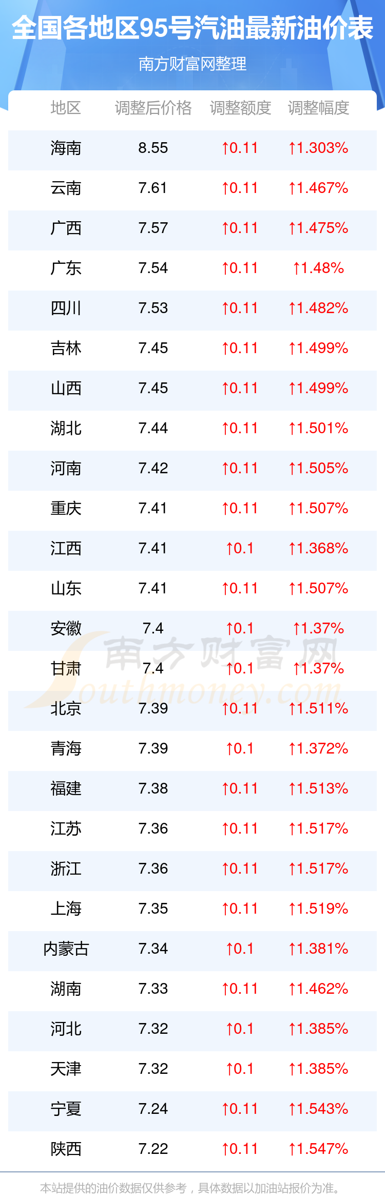 全國各地區(qū)95號汽油油價(jià)一覽表