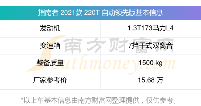 在動力方面,指南者 2021款 220T 自動領(lǐng)先版搭載的是一臺1.3T173馬力L4渦輪增壓發(fā)動機(jī),匹配7擋干式雙離合自動檔變速箱,燃料形式為汽油,常規(guī)整備質(zhì)量1500kg,廠家參考價15.68萬元。
