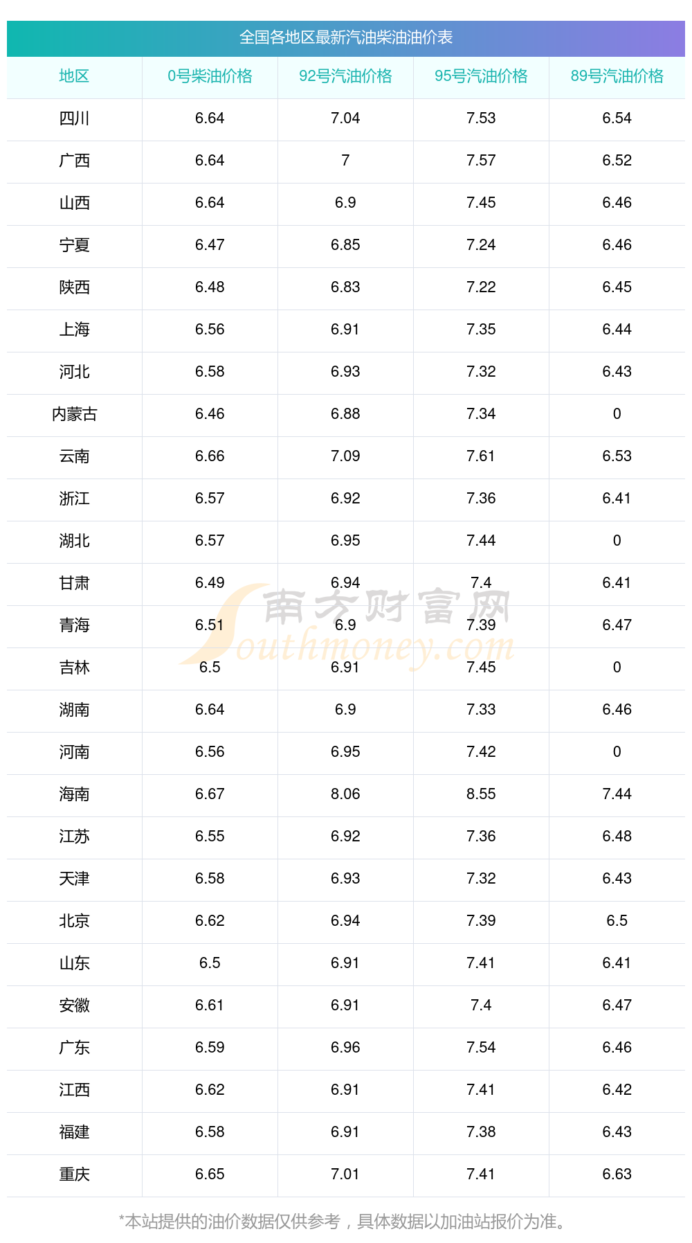 油價(jià)數(shù)據(jù)僅供參考,請(qǐng)以您所在地區(qū)的加油站報(bào)價(jià)為準(zhǔn)。南方財(cái)富網(wǎng)發(fā)布此信息的目的在于傳播更多信息,對(duì)使用該油價(jià)信息所導(dǎo)致的結(jié)果概不承擔(dān)任何責(zé)任。