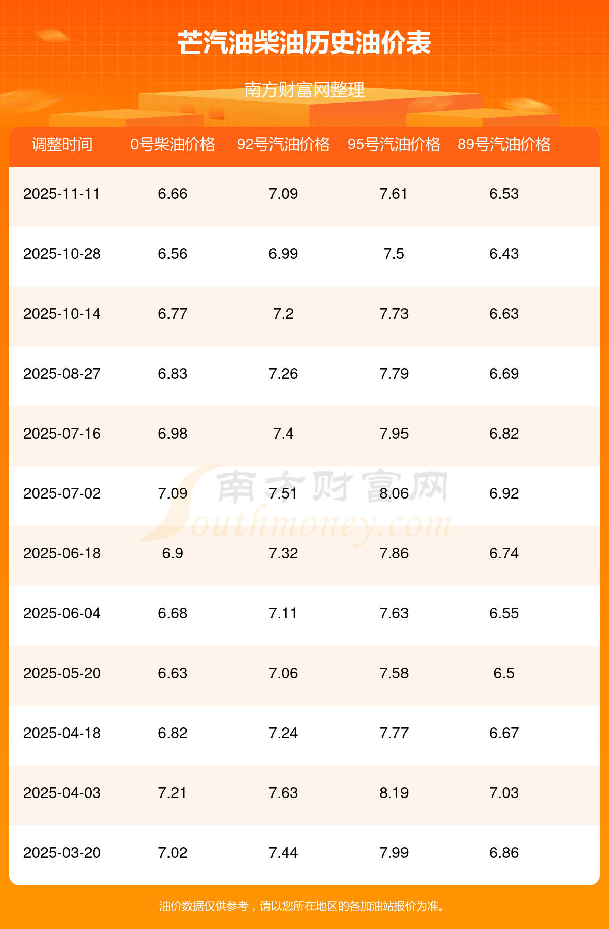 芒汽油、柴油11月11日每升最新價(jià)格為:92號(hào)汽油為7.09元;95號(hào)汽油為7.61元;89號(hào)汽油為6.53元;0號(hào)柴油為6.66元,調(diào)整時(shí)間為11月11日。