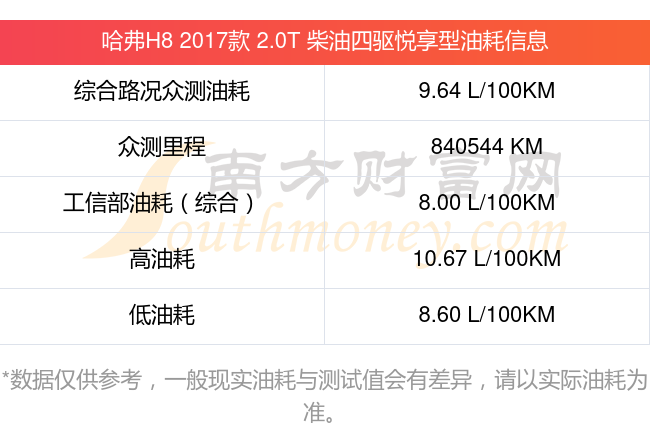 根據(jù)車主實(shí)測(cè)數(shù)據(jù),該車型低油耗為8.60升每百公里,高油耗為10.67升每百公里,綜合路況眾測(cè)油耗為9.64升每百公里,工信部綜合油耗為8.00升每百公里。