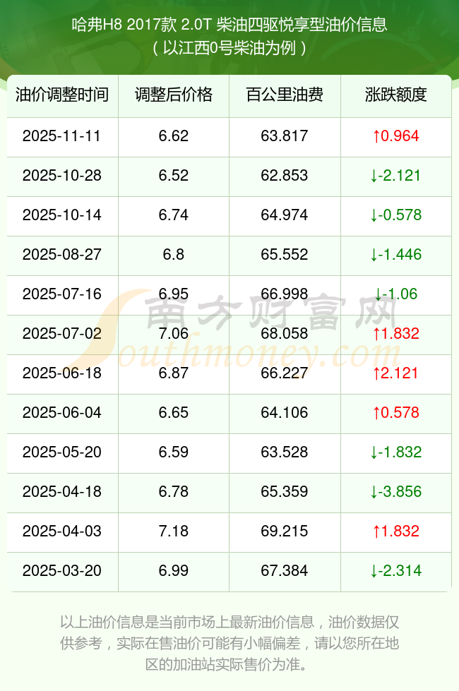 按照11月11日0號(hào)柴油最新調(diào)整價(jià)格6.62元/升來計(jì)算(以江西為例),該車型百公里平均油費(fèi)為63.817元,按照上一輪10月28日調(diào)整價(jià)格6.52元/升來計(jì)算,百公里平均油費(fèi)為62.853元,對(duì)比上一輪多花0.964元,下一輪油價(jià)調(diào)整時(shí)間為11月24日24時(shí)。