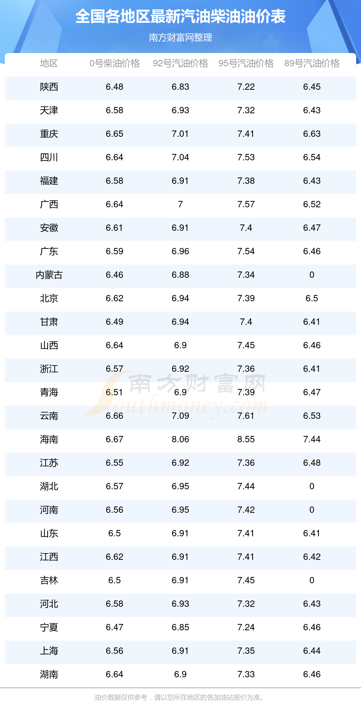 以上油價信息是當(dāng)前市場上最新油價信息,油價數(shù)據(jù)僅供參考,實際在售油價可能有小幅偏差,請以您所在地區(qū)的加油站實際售價為準(zhǔn)。