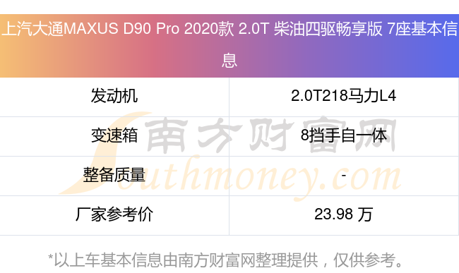 上汽大通MAXUS D90 Pro 2020款 2.0T 柴油四驅(qū)暢享版 7座動(dòng)力上配備的是一臺(tái)2.0T218馬力L4雙渦輪增壓發(fā)動(dòng)機(jī),匹配的是8擋手自一體自動(dòng)檔變速箱,燃料形式為柴油,廠家參考價(jià)23.98萬(wàn)元。
