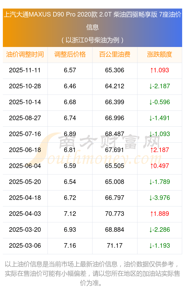 依照11月11日0號(hào)柴油最新調(diào)整價(jià)格6.57元/升來(lái)計(jì)算(以浙江為例),該車(chē)型百公里的平均油費(fèi)是65.306元,依照上一輪10月28日調(diào)整價(jià)格6.46元/升來(lái)計(jì)算,百公里的平均油費(fèi)是64.212元,對(duì)比上一輪多花1.093元,下一輪的油價(jià)調(diào)整時(shí)間11月24日24時(shí)。