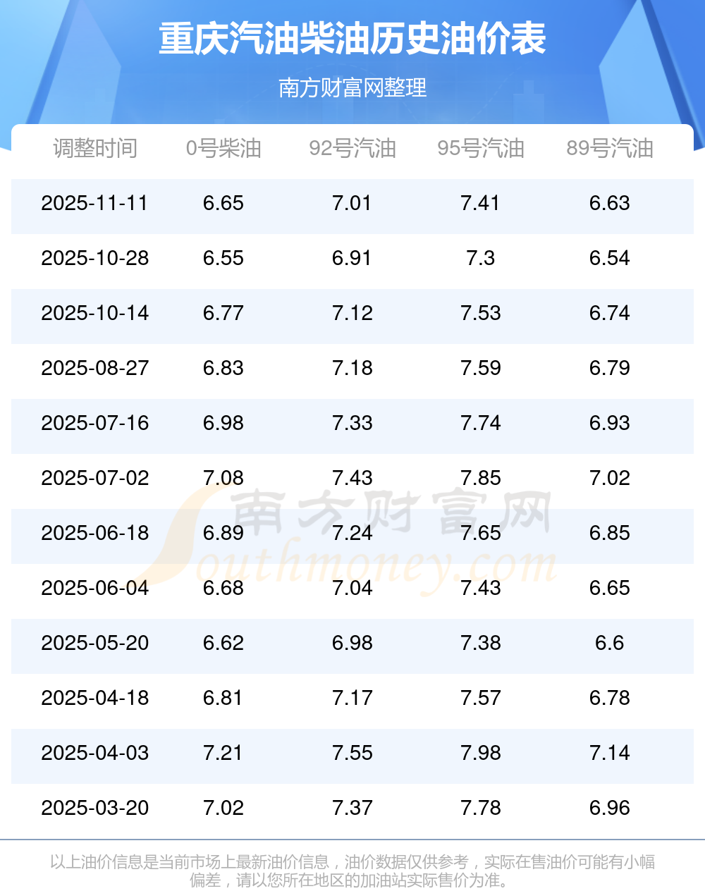 以上數(shù)據(jù)僅供參考,請以您所在地區(qū)的加油站實際售價為準(zhǔn)。南方財富網(wǎng)發(fā)布此信息的目的在于傳播更多信息,對使用該油價信息所導(dǎo)致的結(jié)果概不承擔(dān)責(zé)任。