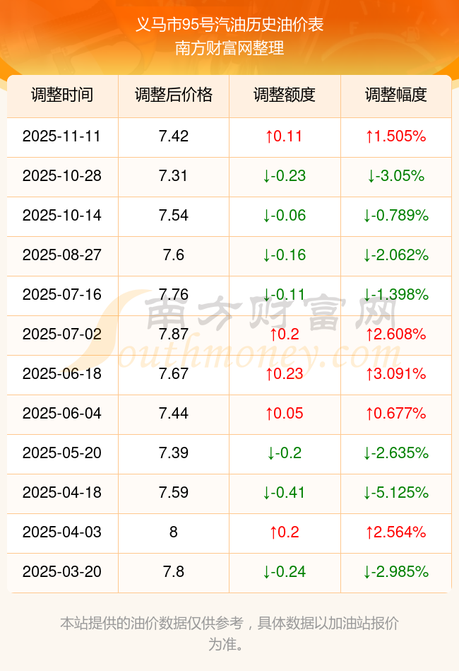 11月11日義馬市95號(hào)汽油歷史油價(jià)調(diào)整一覽表