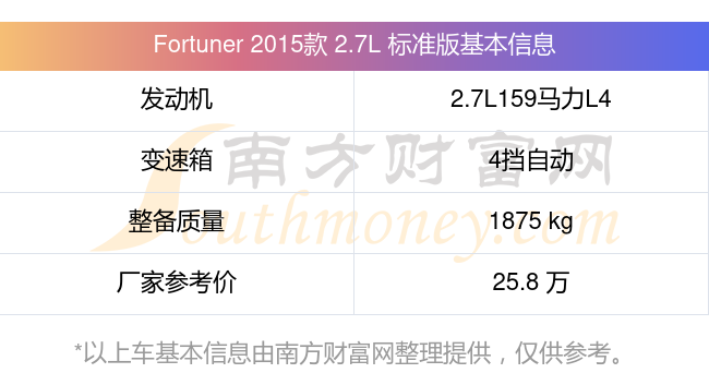 Fortuner 2015款 2.7L 標(biāo)準(zhǔn)版動力方面,搭載的是一臺2.7L159馬力L4自然吸氣發(fā)動機(jī),匹配4擋自動檔變速箱,燃料形式為汽油,常規(guī)整備質(zhì)量1875kg,廠家參考價25.8萬元。