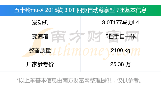 五十鈴mu-X 2015款 3.0T 四驅(qū)自動(dòng)尊享型 7座動(dòng)力上配備的是一臺(tái)3.0T177馬力L4渦輪增壓發(fā)動(dòng)機(jī),匹配的是5擋手自一體自動(dòng)檔變速箱,燃料形式為柴油,常規(guī)整備質(zhì)量2100kg,廠家參考價(jià)25.38萬(wàn)元。