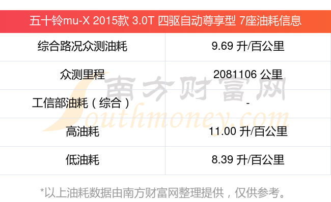 根據(jù)多位車主實(shí)測(cè)得出數(shù)據(jù),該車型低油耗為8.39升/百公里,高油耗為11.00升/百公里,綜合路況眾測(cè)油耗為9.69升/百公里。