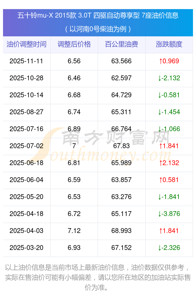 按照11月11日0號(hào)柴油最新調(diào)整價(jià)格6.56元/升來(lái)計(jì)算(以河南為例),該車型百公里平均油費(fèi)為63.566元,按照上一輪10月28日調(diào)整價(jià)格6.46元/升來(lái)計(jì)算,百公里平均油費(fèi)為62.597元,對(duì)比上一輪多花0.969元,下一輪油價(jià)調(diào)整時(shí)間為11月24日24時(shí)。