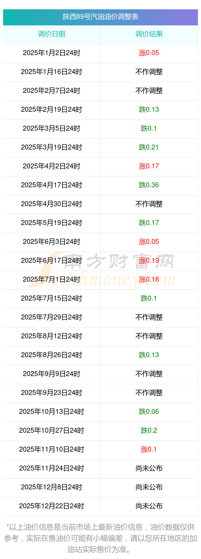 以上數(shù)據(jù)僅供參考,請以您所在地區(qū)的加油站實際售價為準。南方財富網(wǎng)發(fā)布此信息的目的在于傳播更多信息,對使用該油價信息所導致的結果概不承擔責任。